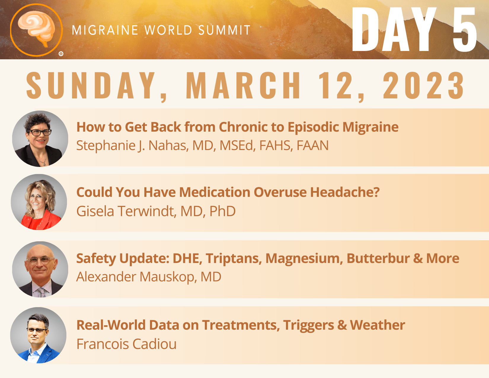 I am honored to speak at this year’s Migraine World Summit on Sunday, March 12. My topic is Safety Update: DHE, Triptans, Magnesium, Butterbur, and more.