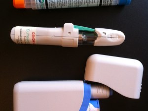 Since we are on the subject of injections, I should point out that they are extremely underutilized. Doctors usually prescribe them if the patient has severe nausea or vomiting and cannot hold down the pill. However, an injection may also be very useful for someone who wakes up with a headache without severe nausea, but they know that the tablet may take 2 hours or longer to provide relief. Taking an injection, which can stop the headache within 10 – 15 minutes, can make a difference between being able to go to work or not. I sometimes take an injection even when I have a mild migraine if it happens at night. The tablet will usually work, but I may have to wait for two hours before I can fall asleep, so I take a shot. From left to right 3 types of sumatriptan injectors: Alsuma, Sumavel, Imitrex injections.